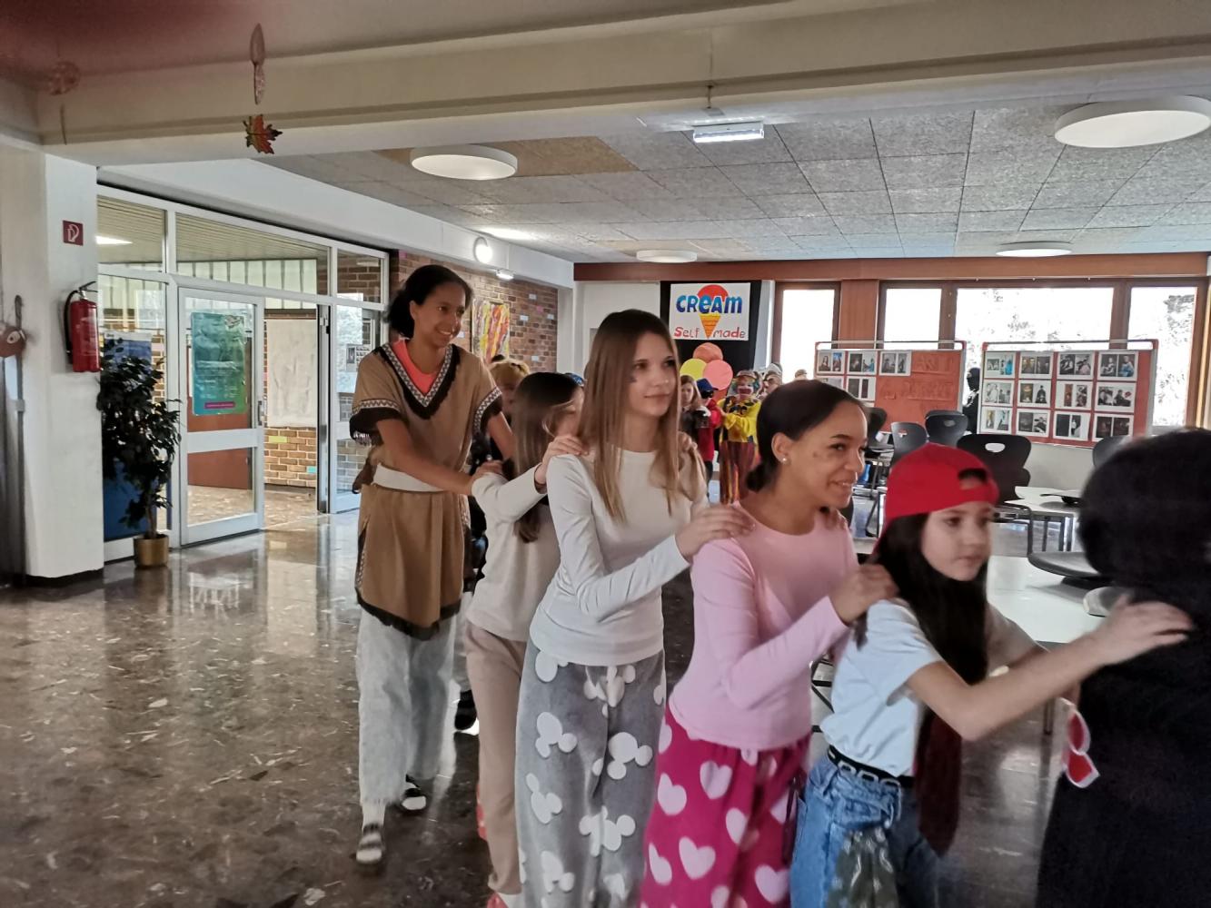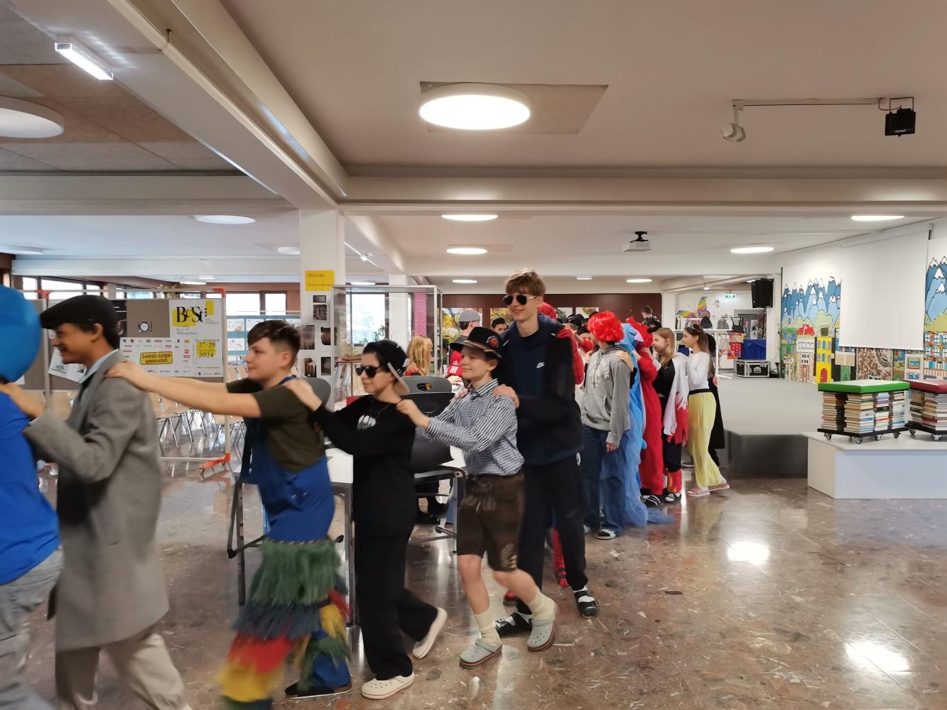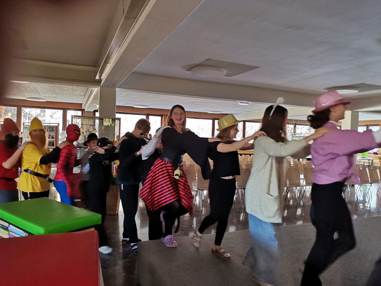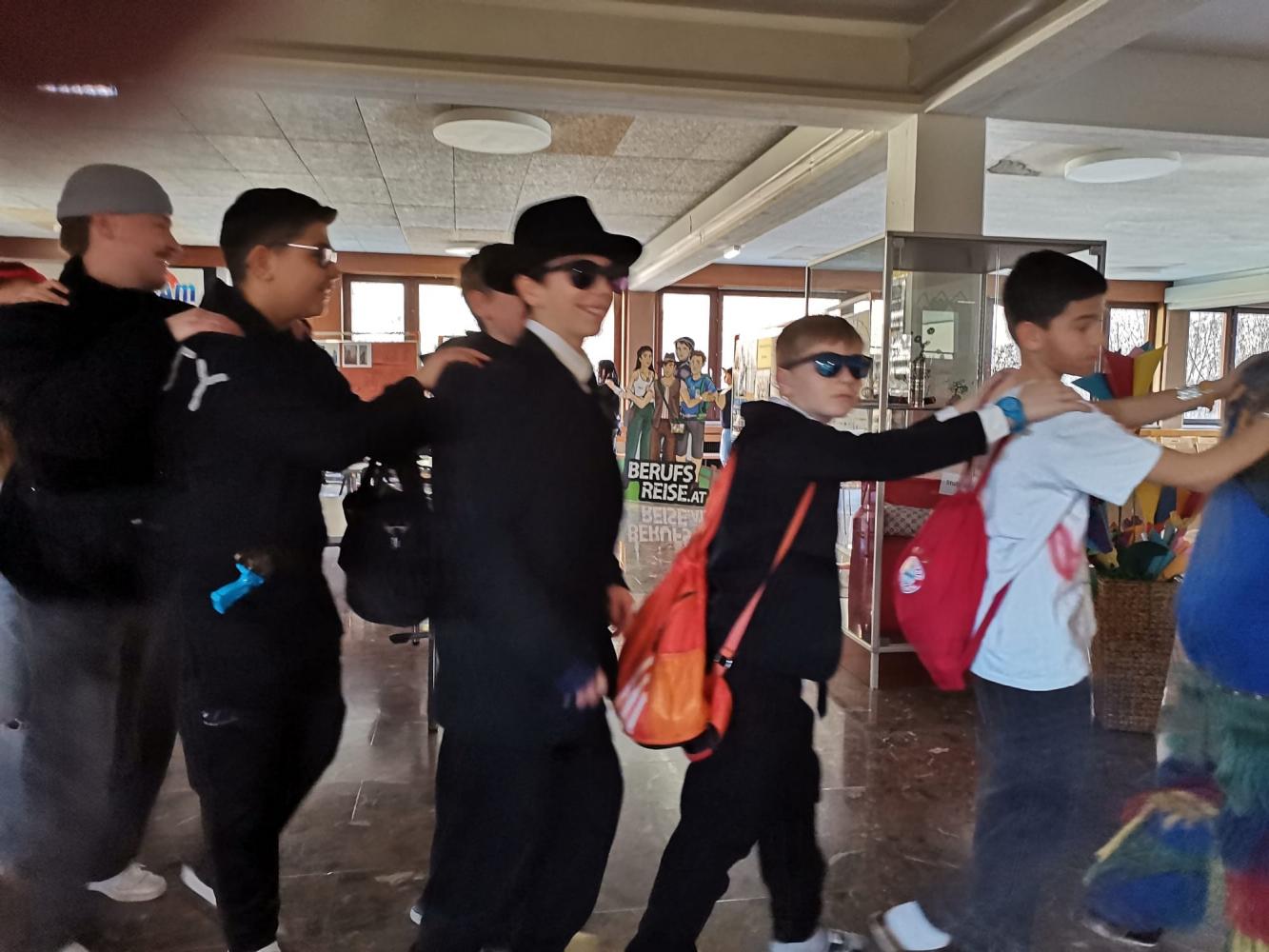 Eine Polonaise durch die Schule von Lisa Robl 09. März 2025 allgemein Anlässlich des heurigen Faschingsdienstags tanzten alle verkleideten Schüler:innen der MS Hötting-West mit Frau Spielmann eine beschwingte Polonaise durch die Schule.